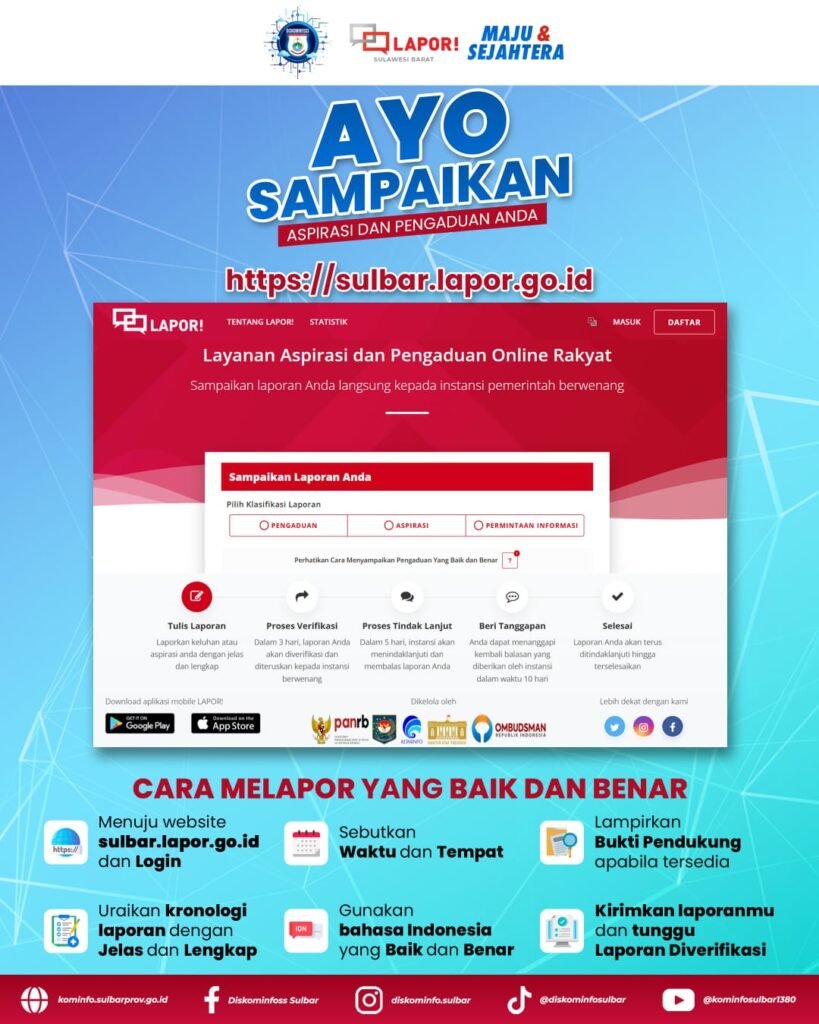 Faktasulbar.com Mamuju –Pemerintah daerah melalui Dinas Komunikasi dan Informatika mengajak masyarakat untuk tidak ragu melaporkan berbagai persoalan pelayanan publik melalui aplikasi SP4N-LAPOR (Sistem Pengelolaan Pengaduan Pelayanan Publik Nasional – Layanan Aspirasi dan Pengaduan Online Rakyat).